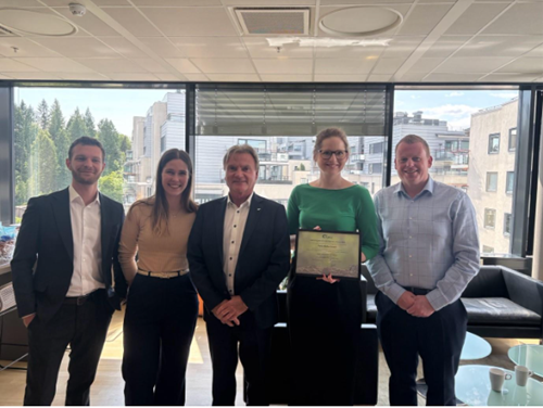 UECC CEO Glenn Edvardsen (centre) with (L-R) Ford representatives Sarp Yasar Cetinkaya, Julia Willmann, Claudia Koenen and Andrew Williams at the presentation of the Proof of Allocation certificate at UECC’s head office in Oslo. Photo: UECC